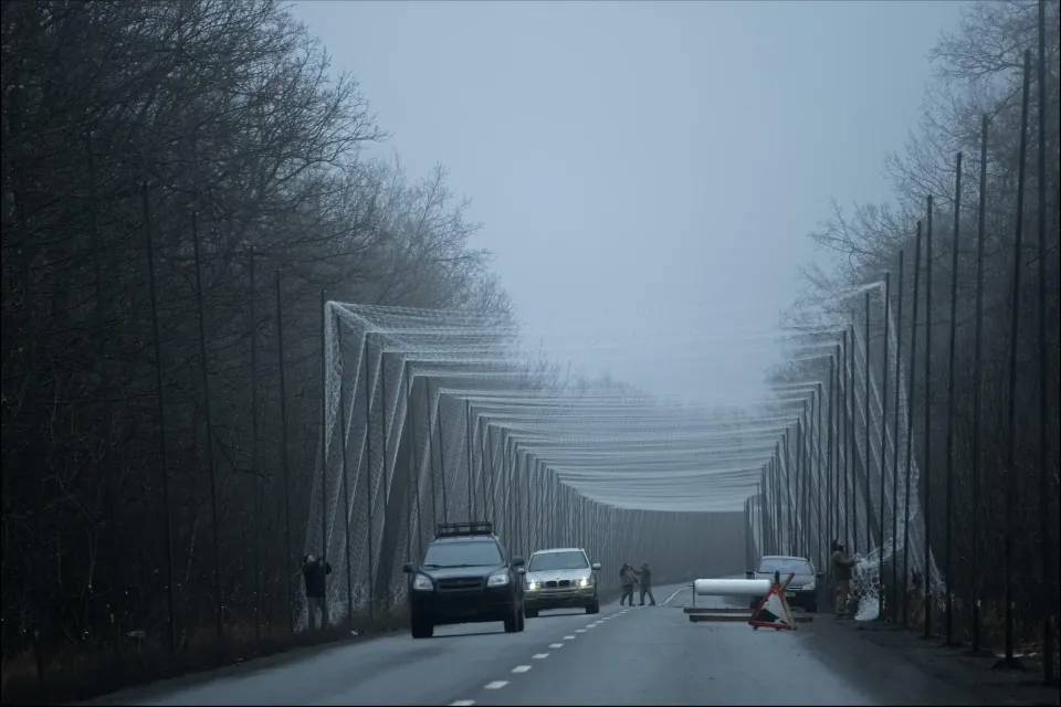 Дорога з Ізюма до Краматорська захищена сітками проти дронів через постійні атаки російських військ на цей маршрут під час наступу на Донбасі. Зелені сітки були подаровані французькими рибалками